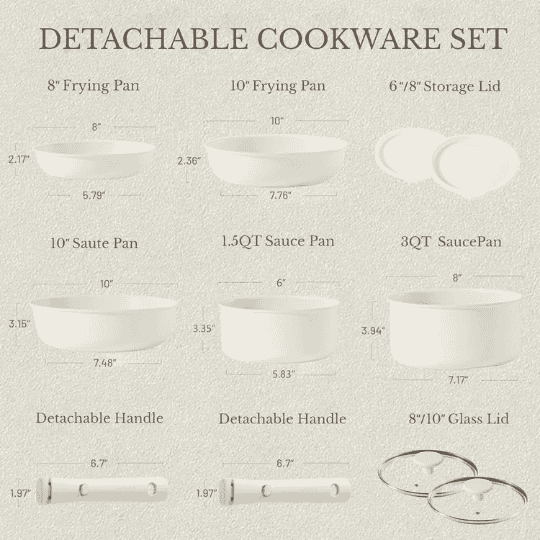 This cookware set is great when storage space is limited. Because of the detachable handle, all 3 pieces of cookware can be stacked easily. The included pads help ensure that when stacked no damage will occur to the cooking surfaces.